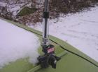 Halterung der NR-770 (2x 5λ/8 auf 70cm + λ/2 auf 2m, Version m. offener Spule) am Heck unter Eisschicht. Innen mündet das RG316 in ein dickeres Koax. |